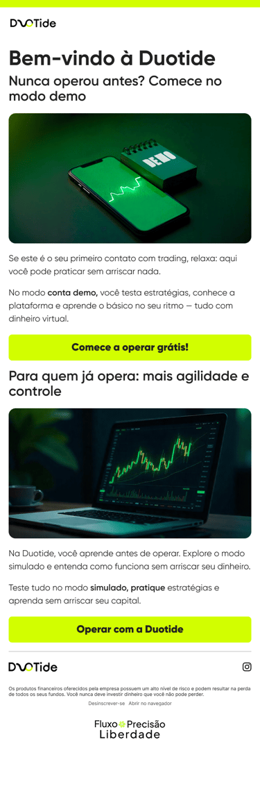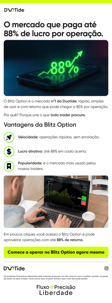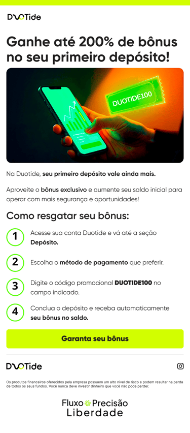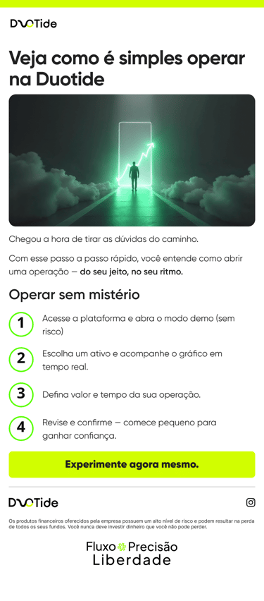 A Duotide é uma corretora focada em operações binárias, com outras modalidades de operação, em um mercado bem competitivo e com muita disputa por atenção. O objetivo do projeto foi adaptar a identidade visual da marca para uma comunicação mais consistente no digital, com peças que ajudassem tanto na presença do Instagram quanto na conversão de usuários ao longo do funil.