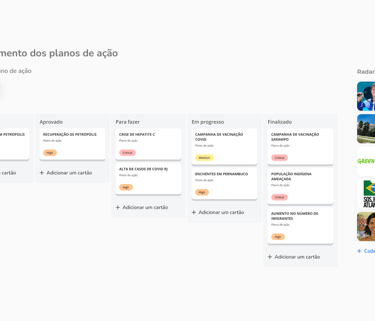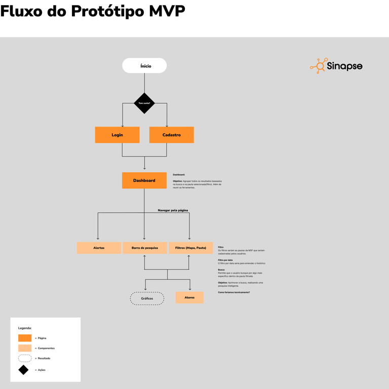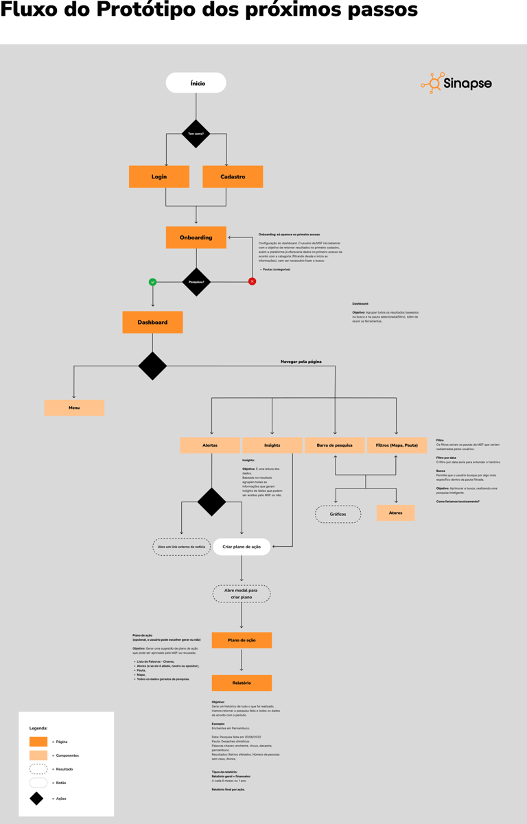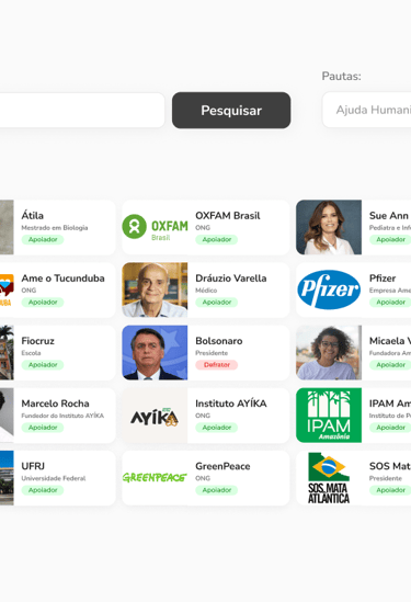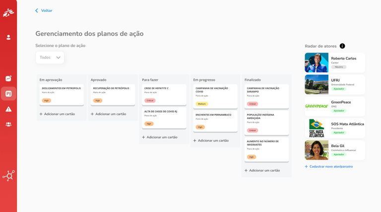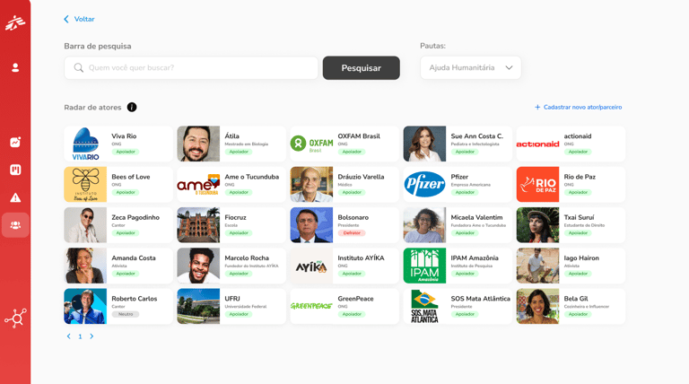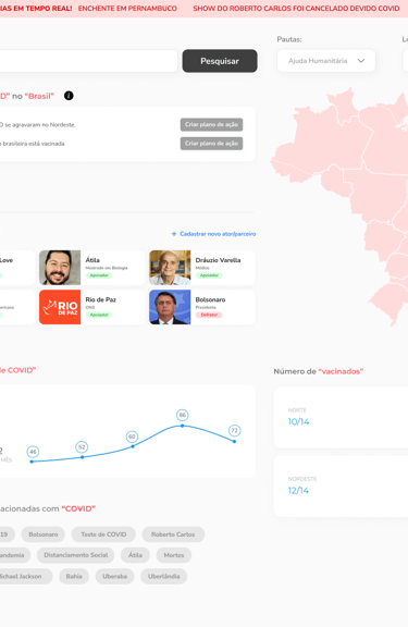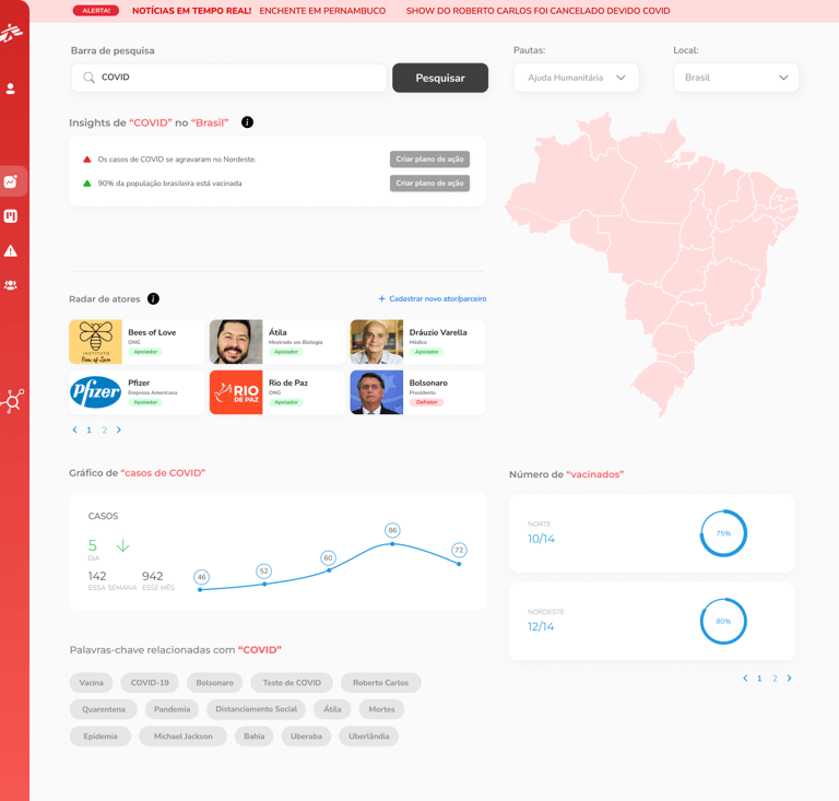 A ferramenta mapeava eventos, gerava alertas e criava cartões com recomendações práticas para analistas, indicando atores relevantes que já possuem histórico de atuação ou que poderiam colaborar na mobilização. Tudo isso visualizado em um mapa interativo do Brasil, onde cada área pulsava conforme o nível e a relevância do impacto.